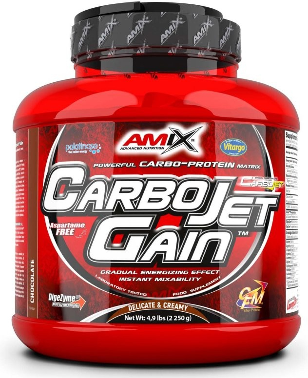 CarboJet™ Gain obsahuje vysoce kvalitní bílkovinyAmix™ Protein Blend a exklusivní komplex sacharidů Amix™ CarboJet™ Matrix zahrnujících vysokomolekulární škrob Vitargo® a postupně vstřebatelnou isomaltulosu Palatinose®. Obsažené bílkoviny přispívají k růstu a udržení svalové hmoty
