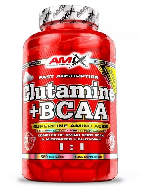 Glutamine + BCAA je produkt s vysokým obsahem větvených aminokyselin BCAA v poměru 2:1:1 v kombinaci s aminokyselinou L-Glutamin.
